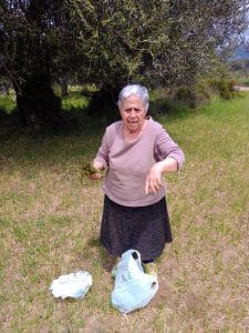 mee op een van haar zoektochten naar wilde groene asperges. Dus gaan we op pad, ik krijg een stok van haar in mijn handen geduwd. Later begrijp ik pas echt waarom. We komen al snel op bergpaden maar de groene asperges vind je daar niet. Die staan veel verder de velden in. En die velden liggen hoger en hoger dus begint ze te klimmen, rotsen op, rotsen af.