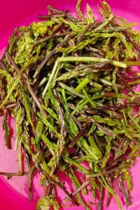 – Kook met een bodempje water de groene asperges samen met een ui in 10 minuten gaar