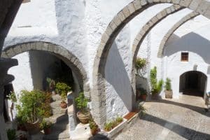 Qua architectuur heeft het klooster een geheel eigen stijl. Zodra je door de prachtige poort komt sta je in een geheel wit geschilderd complex. Er wonen tegenwoordig nog een twintigtal monniken in het klooster. Chora zelf is trouwens ook zeer de moeite waard. Een wirwar van steegjes, trapjes en witte huizen. Je kunt er gemakkelijk verdwalen. In het begin deden wij dat ook, nu kennen we de weg er wel.