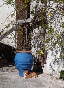 aan toegaat. Overal liggen poezen te soezen in het zonnetje, ik kijk naar de oortjes, knip of geen knip. Als we weer beneden komen ontmoeten we één monnik met wie we een praatje maken en één oude meneer die trots zijn stadje aanprijst. Verder niemand, Lindos is deze dag voor ons alleen.